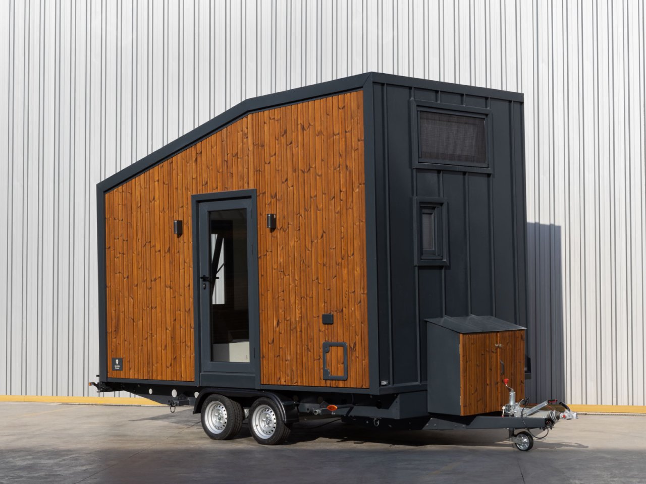 Das äußere Design kombiniert moderne Materialien mit hoher Funktionalität. Die Holzverkleidung an den Längsseiten sorgt für eine warme und natürliche Optik, während die Stirnseiten aus Metall zusätzliche Stabilität und Widerstandsfähigkeit bieten.