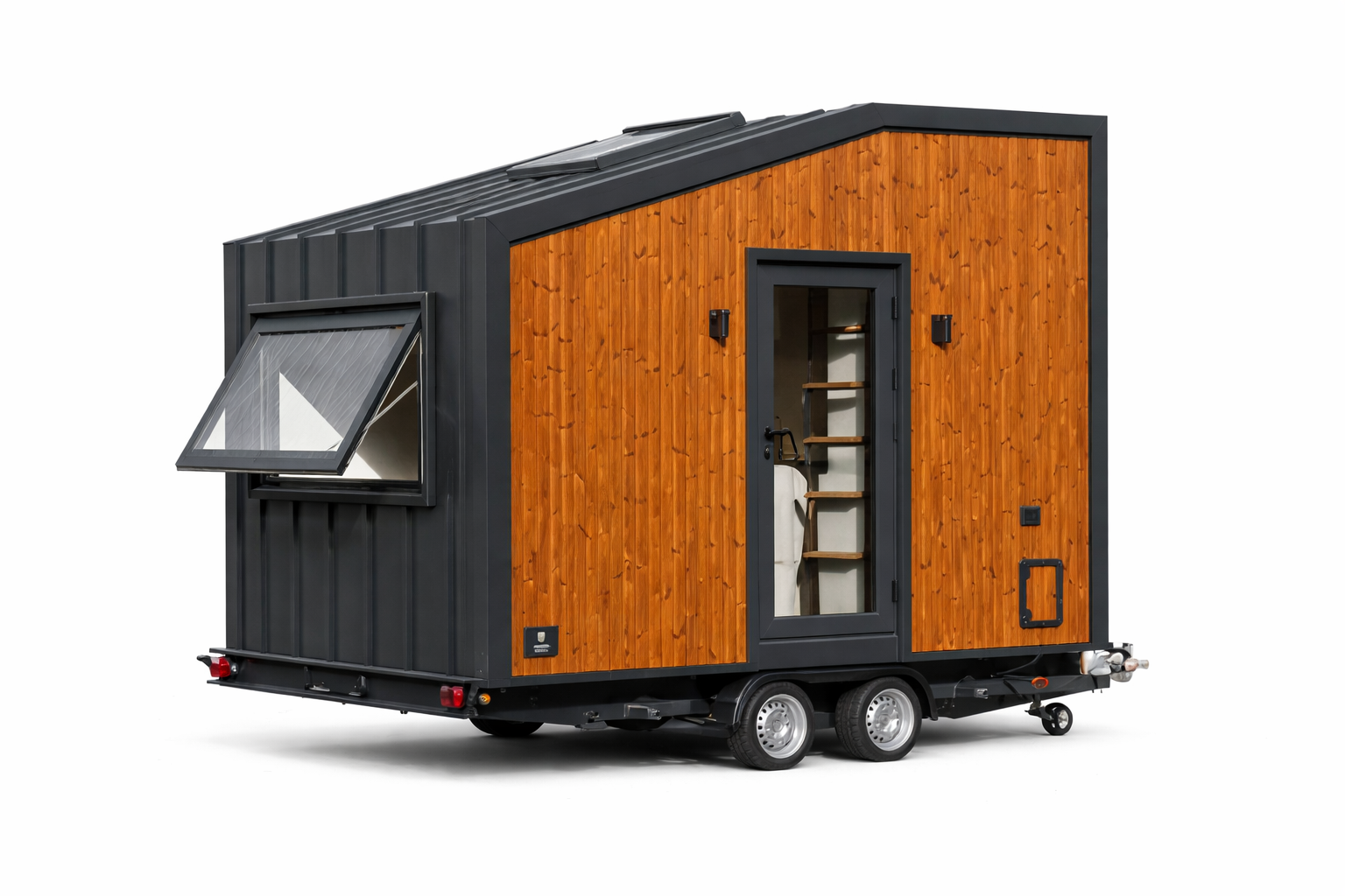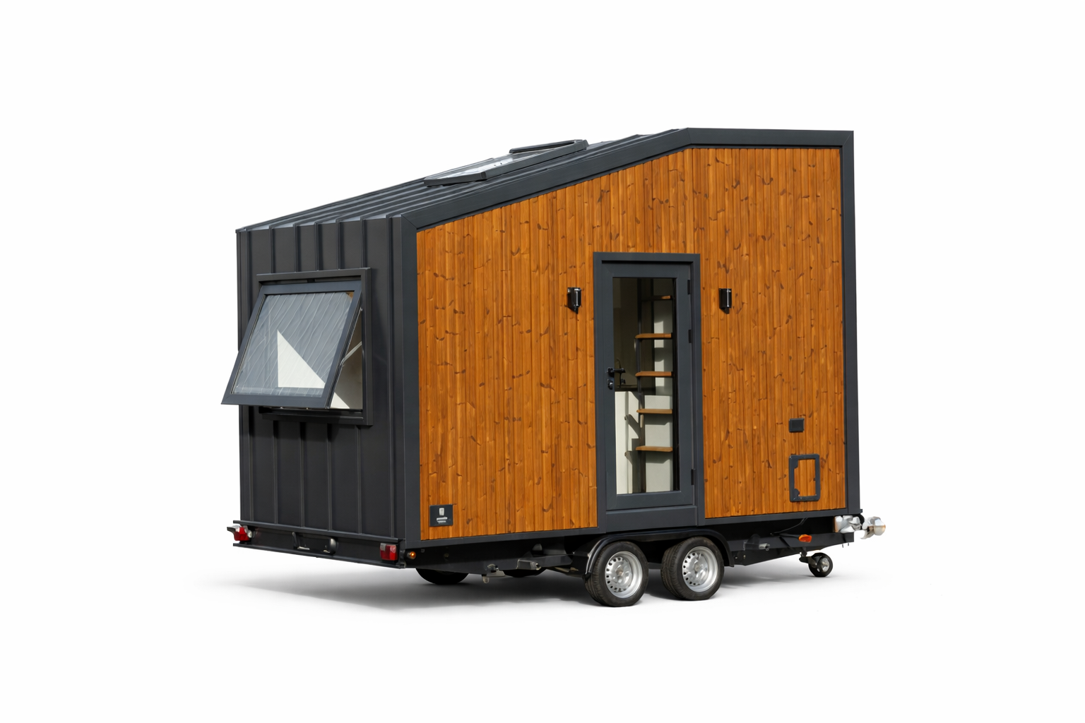 Außenverkleidung aus Holz (Längsseiten) und Metall (Front/Heck)